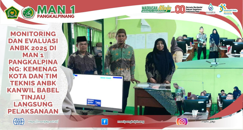 Pangkalpinang, 6 Agustus 2025 — Pelaksanaan Asesmen Nasional Berbasis Komputer (ANBK) Utama Tahun 2025 di MAN 1 Pangkalpinang mendapat kunjungan langsung dari pihak Kementerian Agama Kota Pangkalpinang dan Tim Teknis ANBK dari Kanwil Kemenag Provinsi Kepulauan Bangka Belitung, dalam rangka kegiatan Monitoring dan Evaluasi (Monev), Rabu pagi, 6 Agustus 2025.