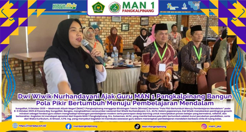 Sungailiat, 9 Oktober 2025 — Dalam upaya memperkuat kompetensi pendidik di era transformasi pendidikan, Madrasah Aliyah Negeri (MAN) 1 Pangkalpinang menggelar Bimbingan Teknis (Bimtek) “Pola Pikir Bertumbuh Menuju Pembelajaran Mendalam (Deep Learning)” selama dua hari, 8–9 Oktober 2025, bertempat di Pesona Bay Sungailiat, Kabupaten Bangka.