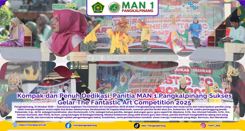 Pangkalpinang, 16 Oktober 2025 — Suksesnya kegiatan The Fantastic Art Competition 2025 di MAN 1 Pangkalpinang tidak lepas dari kerja keras dan kekompakan panitia yang telah mempersiapkan acara sejak dua bulan sebelumnya. Di bawah koordinasi Roviansyah, S.Pd. selaku Ketua Panitia, seluruh tim bekerja dengan semangat tinggi untuk menghadirkan ajang seni yang bermakna bagi siswa madrasah.