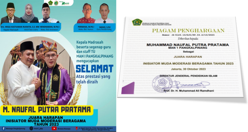 Pangkalpinang (20/11/2023), Muhammad Naufal Putra Pratama adalah nama panjang dari noval, siswa kelas XII IIS 2 MAN 1 Pangkalpinang yang telah berhasil meraih Juara Harapan dalam ajang Pemilihan Inisiator Muda Moderasi Beragama Madrasah Tahun 2023 tingkat Nasional. Kompetisi ini melibatkan peserta dari seluruh Indonesia.